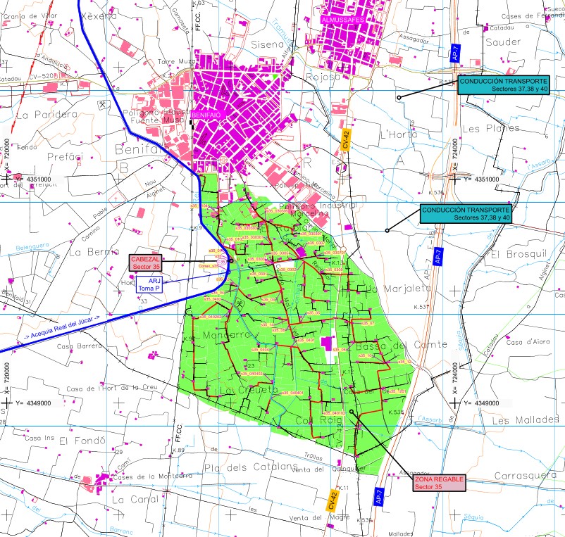 De manera general las actuaciones necesarias para lograr este objetivo consisten en la conexión de la red de distribución del sector 35 con la red de transporte del Sector 38, la construcción del cabezal del sector 35 donde llegará el agua procedente de la red de transporte del Sector 38, construcción de la red de distribución secundaria del Sector 35 hasta los hidrantes multiusuario, construcción de estos hidrantes y red de distribución terciaria desde los hidrantes hasta las parcelas, incluidas las acometidas parcelarias.